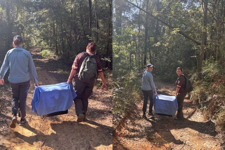 The team ventures deep into the bush to locate these koalas, carrying specially designed traps that are set up around the base of the koala’s host tree. When the koala comes down to move to a new feed tree, it naturally enters the trap, which then closes automatically. A sensor camera facing the trap sends an immediate alert to the field team so they can promptly and safely retrieve the koala.