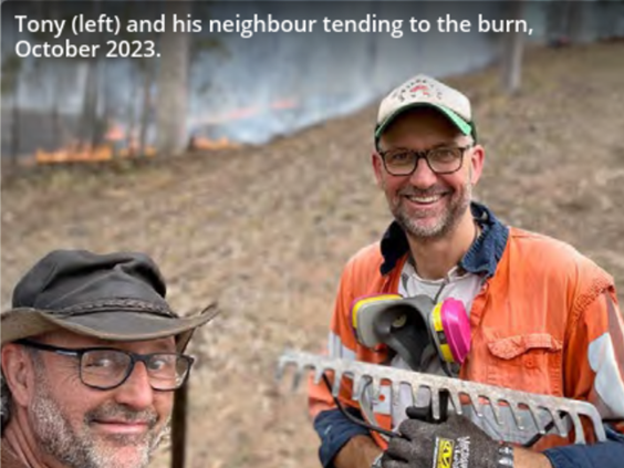 With help from his family and a neighbour, the burn was undertaken over a four-day period, with Tony and his wife monitoring the site during the evening to ensure there were no visible embers. Twelve months after the burn, Tony reported seeing a marked change across his property, with small saplings sprouting through the ash, and great recovery of native grasses, logs and leaf litter for wildlife, leading to a healthier landscape.