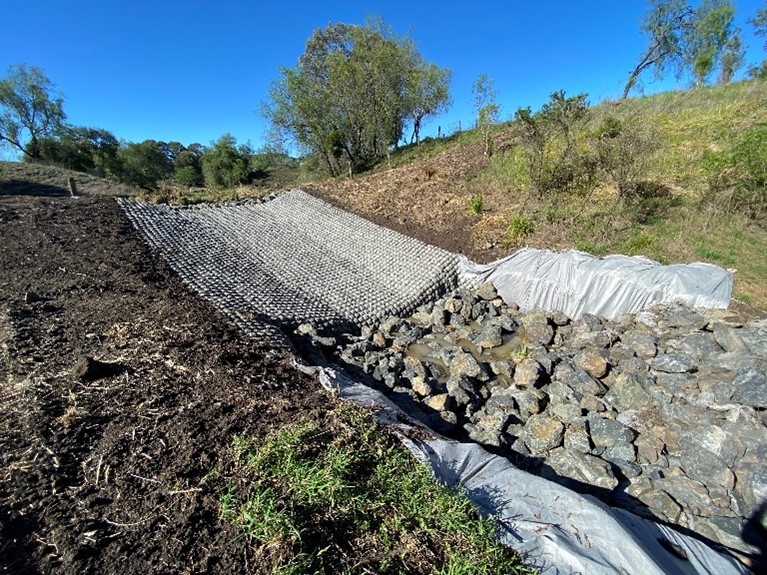On one property, erosion control involved utilising cement mat chutes, fencing, green engineering and revegetation, as a solution to repair and deliver resilience to these gullies during future flooding events.